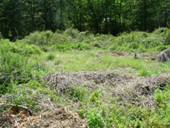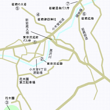 東京炭鉱は、J Rの青梅駅からバスで30分ほどの地点にあり、岩蔵温泉の一つ前の停留所である。ちなみに、バスは通常青梅駅または河辺駅から利用できるが、祭日の交通規制の際には変更もあるのでご注意を。バスを降りたら反対側の道路に渡り、そこから住宅地へと続く道に入っていく。 眼前にも背後にも山や緑が広がり、ちょっとした田舎の風景という感じである。ほどなくして左に入る砂利道があるので、そこを進んでいくと「小曾木4丁目運動広場」が見えてくる。こじんまりした運動場だが、その脇にある草の生い茂った場所がどうやら炭鉱の跡地らしい。「らしい」というのは、見た限りでは炭鉱跡の面影を残すものは何もないためである。以前は堅杭の跡なども残っていたらしいが、それも今は見当たらない。地元の人に話を聞いたところ、「子供の頃にカンテラを持った人たちが入っていく姿を見たのを覚えている」と語ってくれた。数十年先には、バスの停留所のみが唯一その存在を伝えてくれるものになるかもしれない。