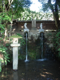 | 深大寺の境内を歩いていると、清らかな小川の流れや澄んだ池、また小さな滝などに所々で遭遇する。ここ調布市は、階段状の段丘面の境界、通称ハケと呼ばれる崖線があるところで、この辺りも昔から崖線下から湧く湧水に恵まれていた土地だ。深大寺も北側は段丘崖となっており、そのハケ下から湧き出す清水が小川となって周囲を巡り、境内周辺の暮らしを潤してきた。水の乏しい武蔵野台地の中で湧き出す豊富な泉水は、この地に水信仰をもたらし、水神と深沙大王が結びついたと考えられている。 |