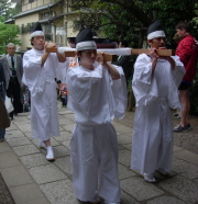 | 三方に盛られたそばを、山門脇に建つそば守観音に奉納する。僧侶とそば職人たちが列を成し、花や供物が捧げられているそば守観音の前にやって来ると、高僧がそばを奉納して経を上げる。その後、そば業者や信者など多くの関係者が参拝し、そば守観音供養祭は終了した。 |